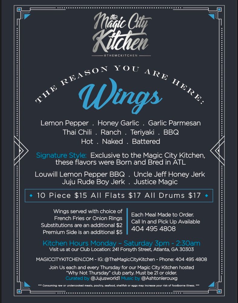 Magic City Kitchen, located in Atlanta, GA, offers a unique fusion of Soul Food, American, and Seafood cuisine. The restaurant provides a range of services such as reservations, delivery, takeout, and catering. With a divey atmosphere, outdoor seating options, and happy hour specials, Magic City Kitchen caters to various dining preferences. Customers have praised the flavorful wings, expansive portions, and the quick service. The LouWill Lemon Pepper BBQ wings and Sweet Potato Fries have been highlighted as standout dishes, with even a vegan option available. The reviews emphasize the consistent quality of the food, making Magic City Kitchen a top favorite in the downtown Atlanta area for those seeking delicious and satisfying meals.